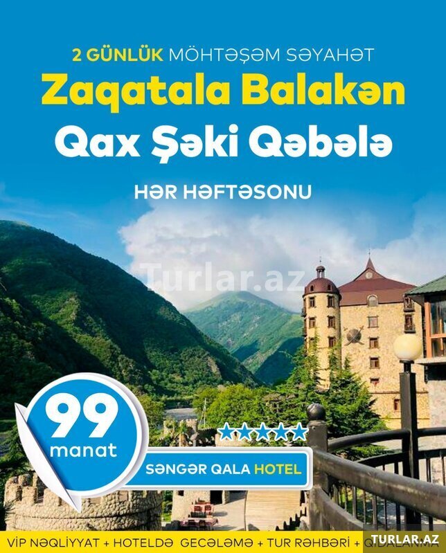 99 Azn Əsl təbiət qoynunda dincəlmək və unudulmaz anlar yaşamaq istəyənlər üçün mükəmməl fürsət: 3 günlük Balakən, Zaqatala, Qax, Oğuz, Şəki yaylası və Qəbələ turu. Turun Təfərrüatları - Müddət: 2 gecə / 3 gün - Qiymət: 149