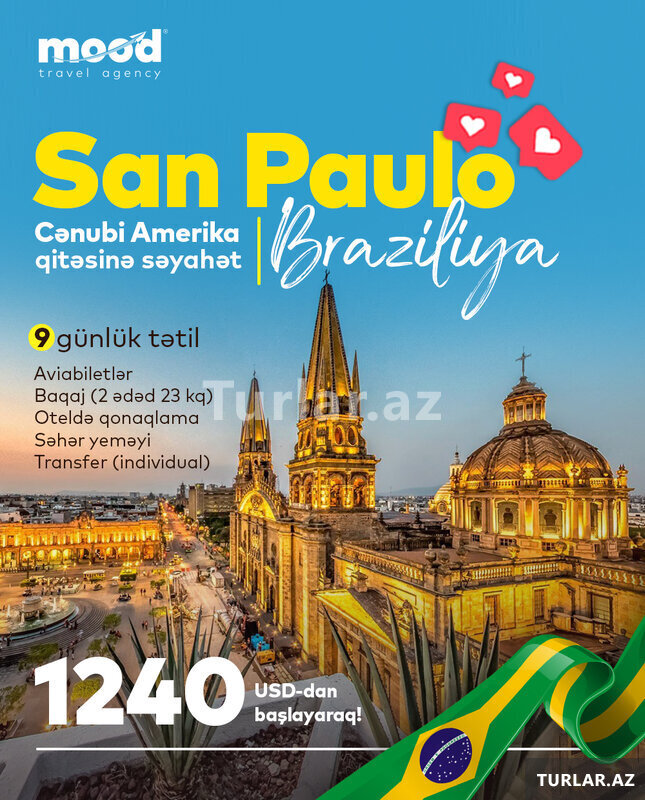 Latın Amerikasının ən böyük şəhərlərindən biri olan San Paulo sizi öz dinamik həyatı, mədəni zənginliyi və rəngarəng atmosferi ilə qarşılayır. Bu səyahət paketi Braziliyanın ritmini hiss etmək, şəhərin incəsənət, gastronomiya və gecə həyatını kəşf etmək üçün mükəmməl fürsətdir.