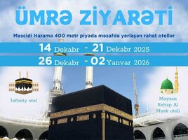 1785 Azn Sezonun xüsusi endirimi ilə Ümrə ziyarətini daha sərfəli qiymətlərlə həyata keçirin. Paket Qiymətləri: - 4 nəfərlik otaqda – 850 USD - 2 nəfərlik otaqda – 990 USD Səyahət müddəti: 7 gecə / 8 gün Qiymətə Daxildir: -