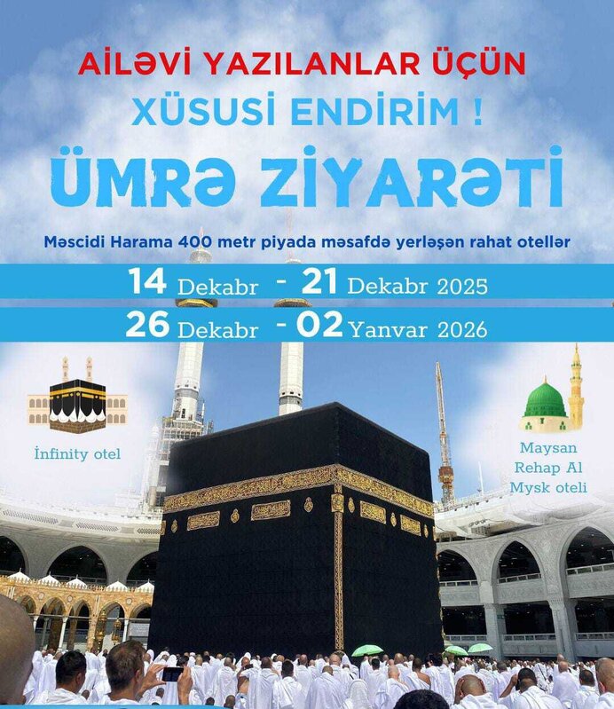 Əziz müsəlmanlar, sizi müqəddəs Ümrə ziyarətinə dəvət edirik. Bu ziyarət, İslamın ən mühüm ibadətlərindən biri olmaqla yanaşı, ruhani və mənəvi dəyər qazandıran möhtəşəm bir səfərdir. Qiymət: 849 USD Paketə daxildir: -