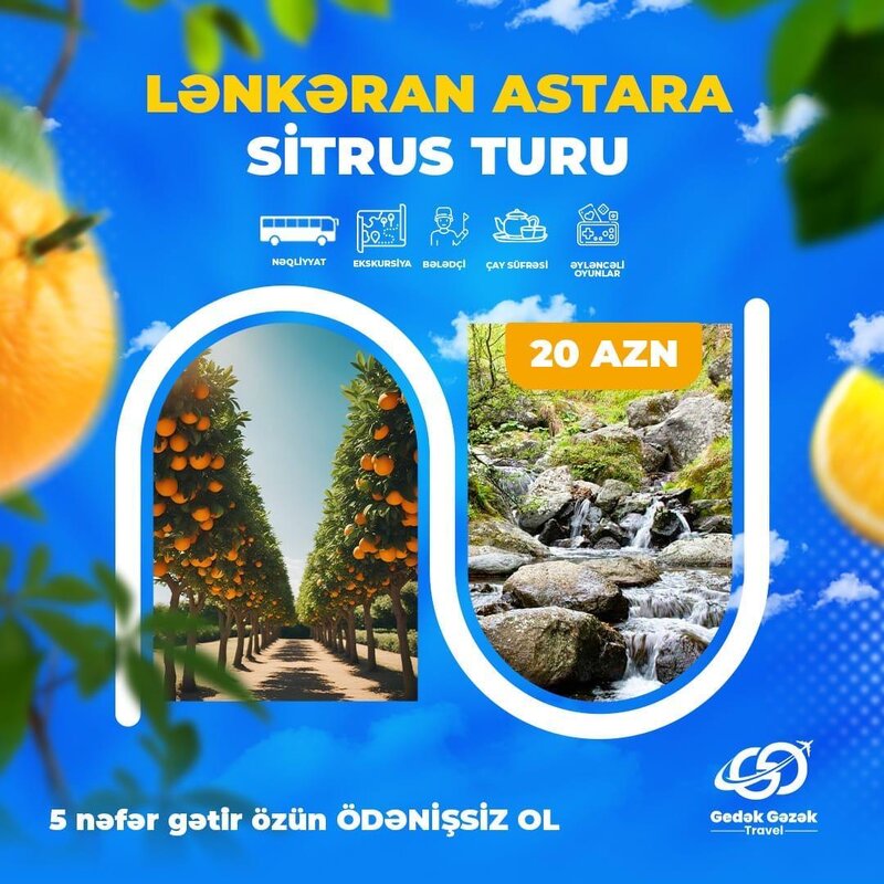 Şirkət119 Azn Lənkəran Astara Sitrus turu Tarix : Oktyabr ayı və hər həftə sonu Qiymət Ekonom paket: 20 AZN Standart paket: 25 AZN Qiymətə daxildir Komfortlu nəqliyyat. Tur rəhbəri. Səhər yeməyi. (Standart paketə daxildir) Qayıdışda