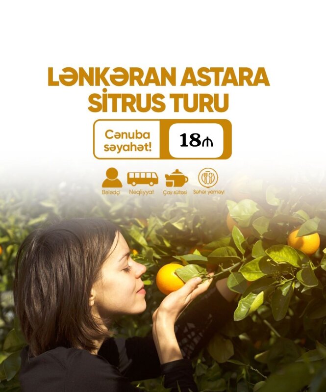 Şirkət25 Azn ~ Lənkəran Astara Sitrus turu •Turun tarixi: 8, 9, 15, 16, 22, 23, 29, 30 Noyabr! •Turun qiyməti: ~ Ekonom paket: 18 azn ~ Standart paket: 23 azn ✓Qiymətə daxildir: •Nəqliyyat ximdəti •Tur rəhbəri •Səhər yeməyi