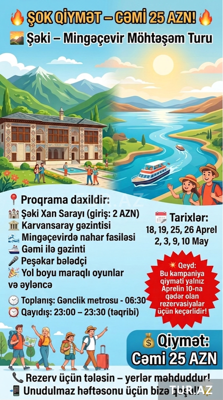 25 Azn Müddət: 1 gecə / 2 gün Qiymət: - Həftə içi: 89 AZN - Həftəsonu: 99 AZN Paketə daxildir: - VIP Nəqliyyat – Rahat və təhlükəsiz səyahət - Peşəkar Tur Rəhbəri – Ekskursiyalar zamanı ətraflı məlumatlandırma - Grata Otel