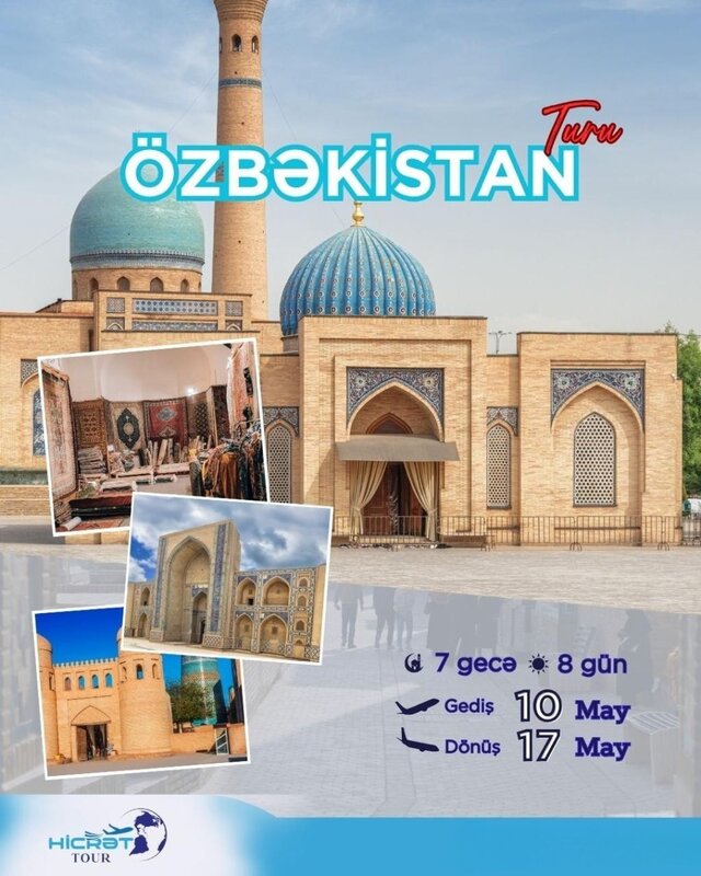 Şirkət HİCRƏT TOUR ailesi Aprel ayında Özbəkistan turu Mərkəzi Asiyanın qəlbi - Özbəkistanla tanışlıq Əsrarəngiz təbiətini, dadlı mətbəxini birlikdə kəşf edək DAŞKƏND, SƏMƏRQƏND, BUXARA Şəhərlər arası transfer Tur bələdçisi və
