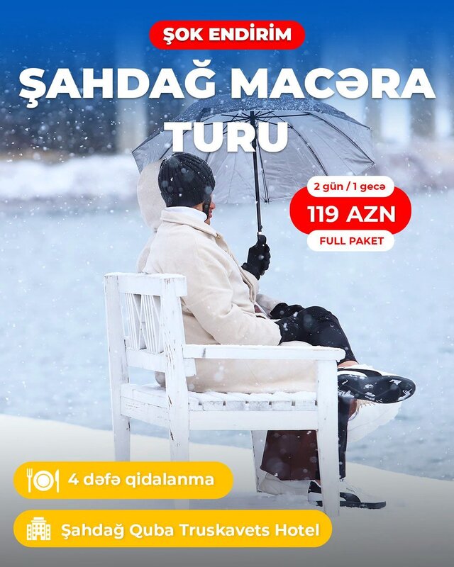 25 Azn ŞAHDAĞ MACARA TURU - Nağıllar aləminə hazır olun - QUBA ŞAHDAĞ TRUSKAVETS OTEL - 119 ₼ ( 1 gəcə 2 gün) Səhər, günorta, axşam yeməyi daxildir. 189₼ (2 gecə 3 gün) - Turun tarixləri: ︎ 13-14 Dekabr (qış sezon açılışı) ︎