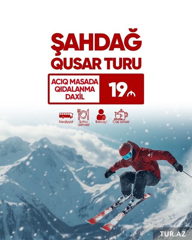 25 Azn Qış Mövsümünün Möhtəşəm Adrenalin və Əyləncə Dolu Turu Şahdağ Qış Turu Tarix: 30, 31 Dekabr Növbəti ay: 1, 2, 3, 4, 10, 11, 13, 14, 15, 17, 18, 20, 21, 22, 24, 25, 27, 28, 29, 31 Yanvar Qiymət: •Ekonom paket: 17