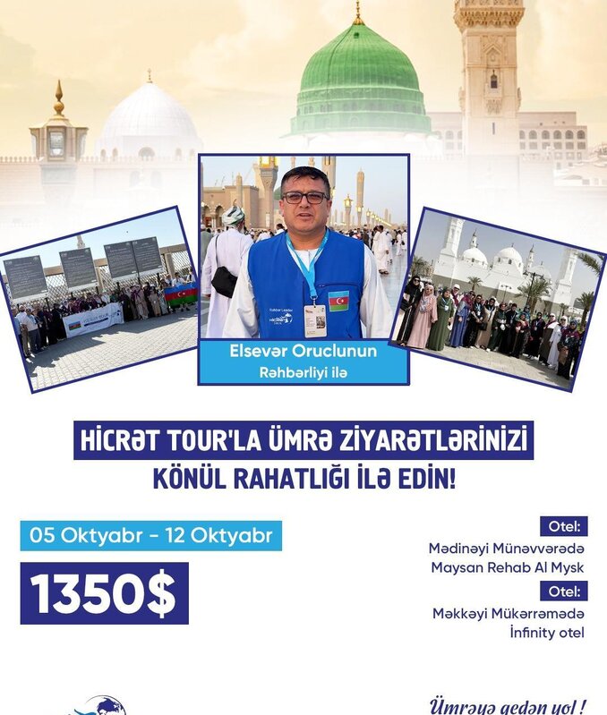 840 Azn Ümrə ziyarəti üçün tam xidmət paketləri təklif edirik. Məkkə və Mədinə ziyarətləri, yüksək komfortlu aviabiletlər, viza dəstəyi, 4 və 5 ulduzlu otellərdə yerləşmə, qrup və fərdi turlar təşkil edirik. Təcrübəli