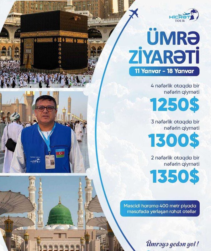 1300 Azn HİCRƏT TOUR, Ümrə və Həcc ziyarətlərinizi rahat , mənəvi və unudulmaz bir təcrübəyə çevirmək üçün sizin xidmətinizdədir.Biz sizə ruhən dolğun, mənəvi bir ziyarət təqdim edirik.
