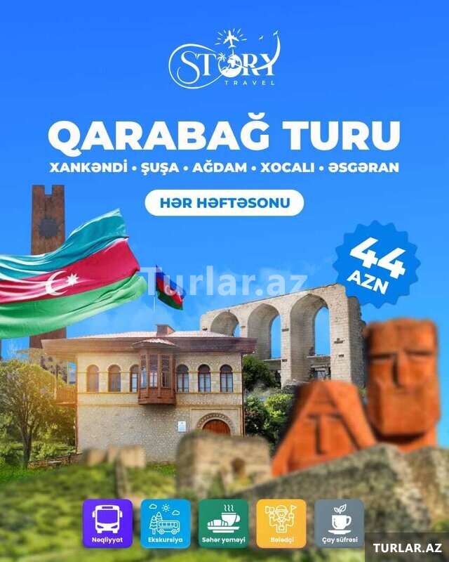 Xankəndi - Şuşa - Ağdam - Xocalı - Əsgəran turu Tarix : 23, 24, 26, 27, 30, 31 iyul 2, 3, 6, 9, 10, 13, 16, 17, 20, 23, 24, 27, 30, 31 Avqust Qiymət: Ekonom paket: 55 azn. Standart paket: 60 azn. Qiymətə