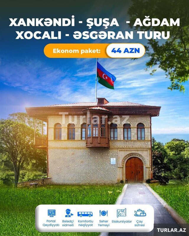 Xankəndi - Şuşa - Ağdam - Xocalı - Əsgəran turu Tarix : Şənbə və bazar günləri Qiymət: Ekonom paket: 44 azn. Standart paket: 49 azn. Qiymətə daxildir: Portal qeydiyyatı Nəqliyyat xidməti Ekskursiyalar Tur rəhbəri Səhər