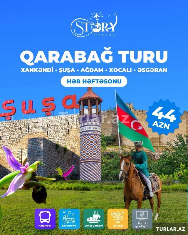 Şirkət44 Azn Xankəndi - Şuşa - Ağdam - Xocalı - Əsgəran turu Tarix : Şənbə və bazar günləri Qiymət: Ekonom paket: 44 azn. Standart paket: 49 azn. Qiymətə daxildir: Portal qeydiyyatı Nəqliyyat xidməti Ekskursiyalar Tur rəhbəri Səhər