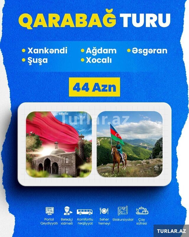 Xankəndi - Şuşa - Ağdam - Xocalı - Əsgəran turu Tarix : Şənbə və bazar günləri Qiymət: Ekonom paket: 44 azn. Standart paket: 49 azn. Qiymətə daxildir: Portal qeydiyyatı Nəqliyyat xidməti Ekskursiyalar Tur rəhbəri Səhər