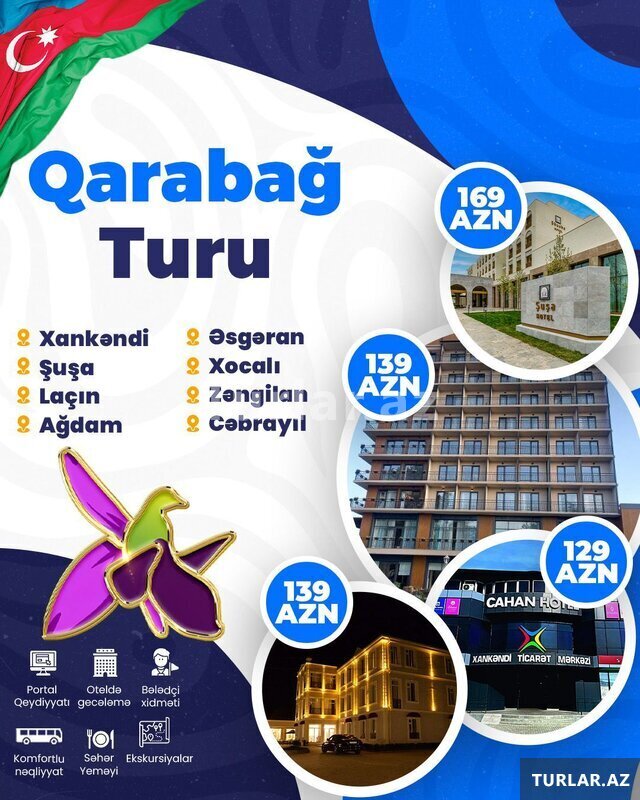 Şirkət109 Azn XANKƏNDİ-ŞUŞA-LAÇIN AĞDAM-ƏSGƏRAN-XOCALI-ZƏNGİLAN-CƏBRAYIL TURU • Tarix: 22-23, 9-30 Noyabr —- ŞUŞA HOTEL 5* 169 azn. QARABAĞ HOTEL 4* 139 azn. Çinar HOTEL 4* 139 azn. CAHAN HOTEL 4* 129 azn. Qiymətə daxildir * Portal