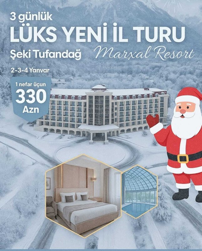 Şirkət159 Azn QUBA QUSAR MACARALI QARLI MÖHTƏŞƏM TURU! Yeni il səyahətlərinizi möhtəşəm 5 ulduzlu Arena Gran Hoteldə keçirməyə tələsin. — Turun tarixləri: ︎ 31-2 Yanvar ︎ Turun müddəti- 3 gün / 2 gecə Qiymət: 259 ₼ ( bir nəfər